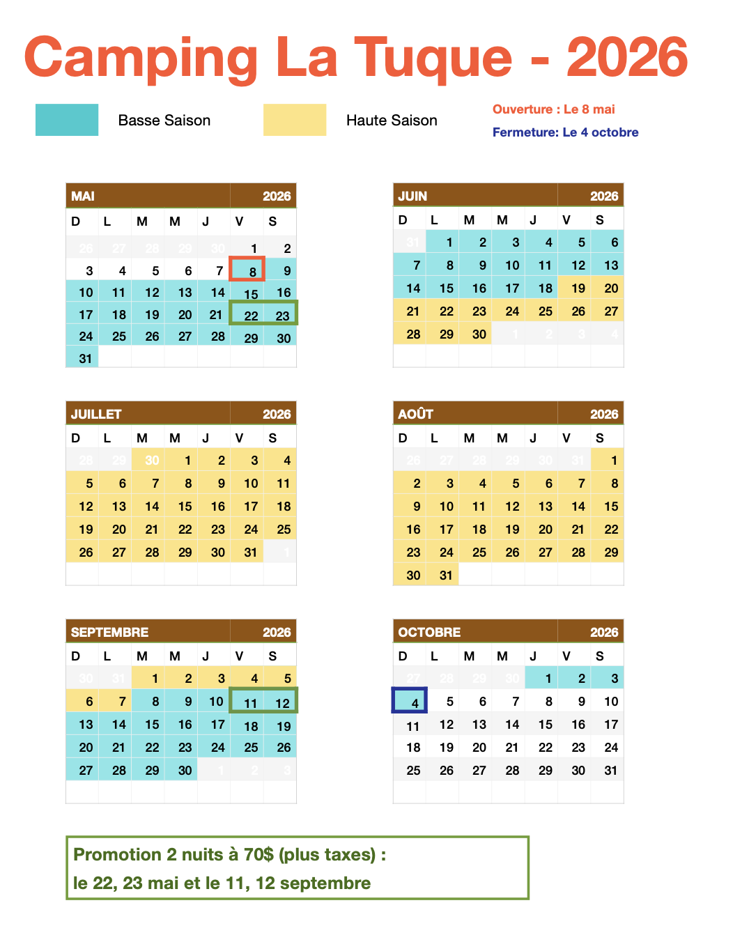 - Participe à la promotion spéciale (2 nuits à 70$ taxes en sus – 22 et 23 mai, 11 et 12 septembre 2026)
